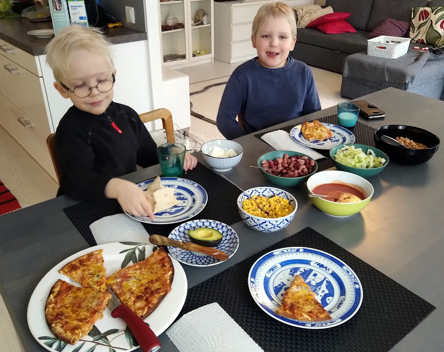 Miika pudotti vauhdissa pojat kotiovellemme. Jussi hyppäsi kyytiin ja miehet huristivat mökille. Katto tuli puhtaaksi hetkessä. Minä ehdin sillä välin tarjota pojille lounaan. Kyselin eilen puhelimessa, mitä pojat haluavat syödä. ”Tortilloja kuului vastaus”. Niinpä katoin niitä lisukkeiden kera pöytään. ”Onko myös pizzaa?” kuului seuraava kysymys. Pakastimesta löytyi parikin vaihtoehtoa. Kaikki maistui.