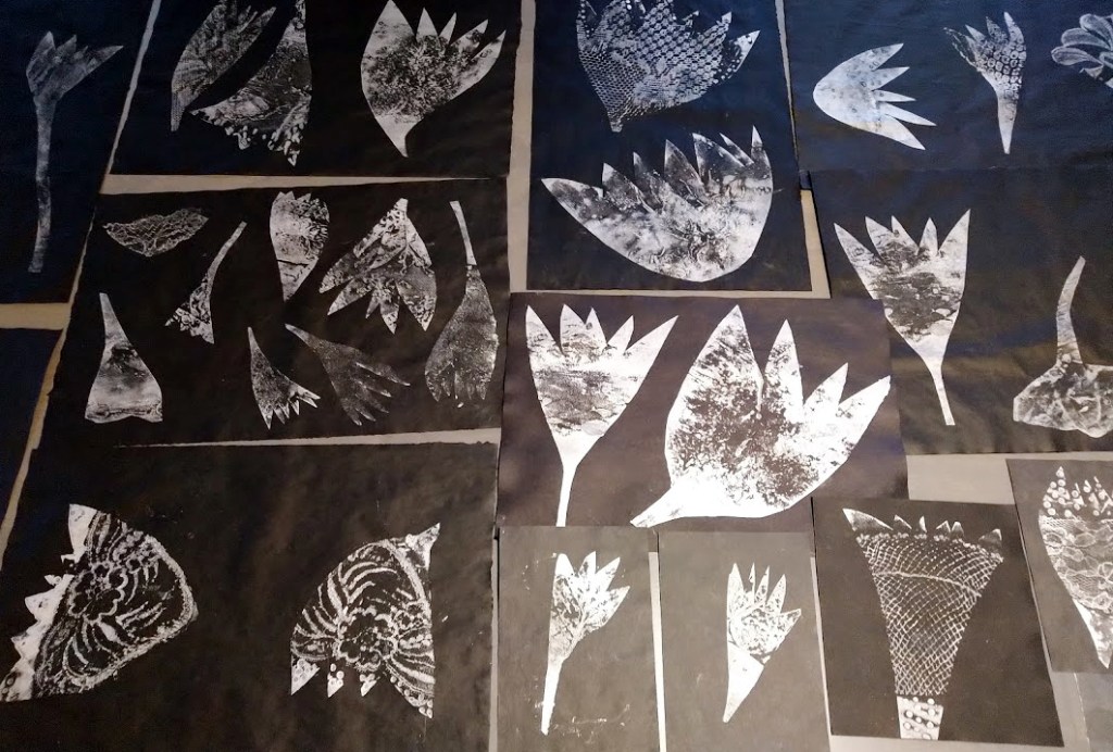 Minä vietin pari tuntia grafiikanpajallamme ja vedostin hopeakukkia mustalle paperille. Suunnitteilla on kukkamosaiikki. Valmistelen siihen materiaalia.
