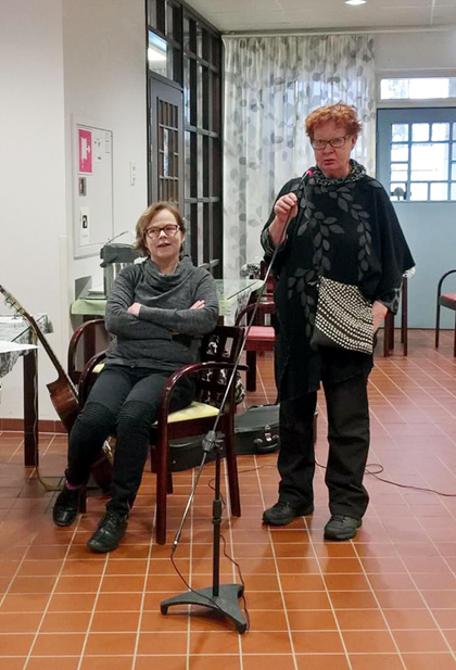 Hankkeen ideoija Tiina-Katriina piti lyhyen puheen. Lyhyen siksi, että mikrofoni rupesi rätisemään. ”Aika lopettaa”, hän totesi. Hetken teknisen virityksen jälkeen puheenjohtajamme Petra lauloi runsaslukuisen yleisön iloksi kitaran säestyksellä talvipäivään sopivia kappaleita.