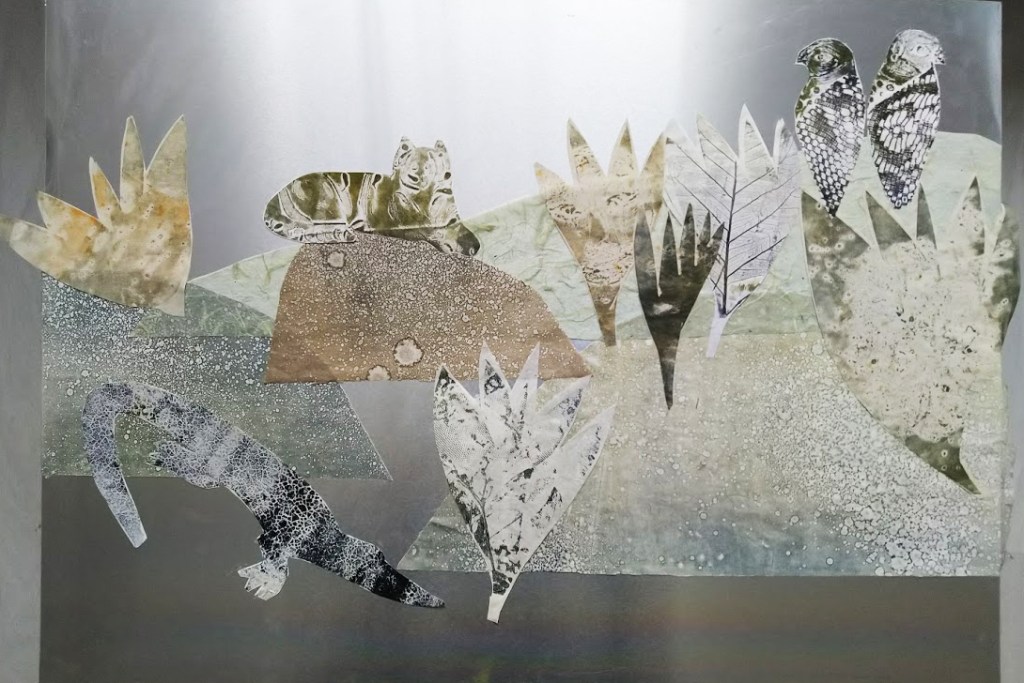 Minä olin varautunut kurssiin vedostamalla grafiikanpajallamme materiaalia. Repusta löytyi värillisiä taustapapereita sekä kukkia ja eläinhahmoja. Otin mukaan pari offsetpeltiä, joille sommittelin villin viidakon ja savannin. Viidakosta ei tosin tullut villi vaan aika kesy.