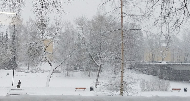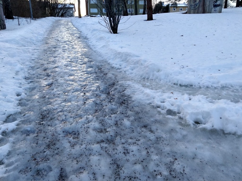 Suojakeli jatkuu. Lämpötila on edelleen plussan puolella. Ja liukasta on. Kaupungin kadut ovat sulat, mutta heti kun erehtyy pikkuteille, saa olla varuillaan.