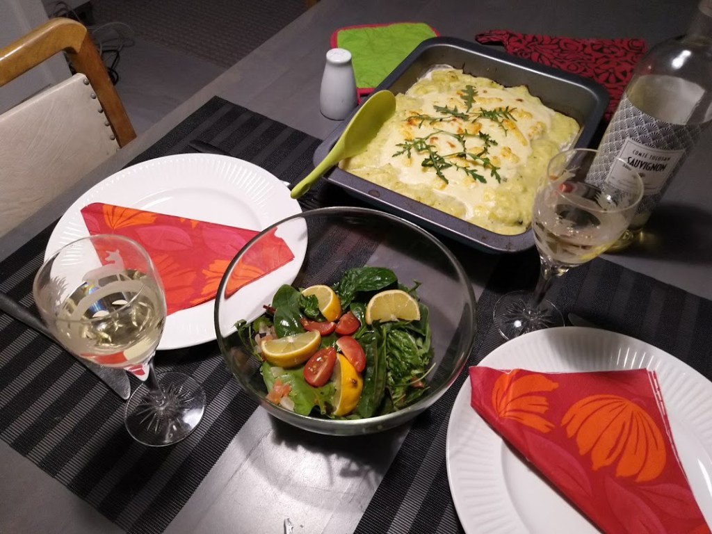 Aikaa ja valkoviiniä kului. Se kannatti, sillä illallinen oli ylellinen. Nyt edessä on työpajapäiviä, estetiikan viikonloppukurssi ja sen jälkeen vierailu Vihdin talviteatteriin. Meillä jää tänä vuonna traditsionaalinen laskiaisrieha Nummelassa väliin. Olemme silloin lomamatkalla. Siksi onkin mukava vierailla Liin ja Kaizun luona viikonloppuilottelun merkeissä.