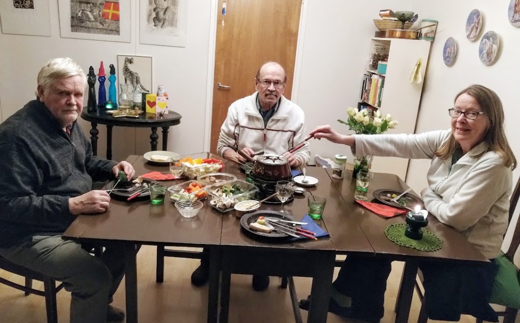 Kasvisfondueillallinen oli maittava. Tarjolla oli myös lihansyöjille lihaa. Minä olin täysin tyytyväinen kasvisateriaan. Varsinkin kun nautimme sen kera hyvää valkoviiniä. Viinin ja estetiikan kurssini innoittamina meillä oli vilkas keskustelu maapallon tilasta. Teoreettinen kurssi pöllytti tehokkaasti aivoja ja oli ilo jakaa sitä energiaa muillekin.