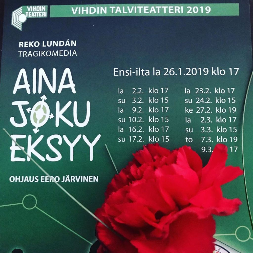 Kappale oli koskettava, mutta turhan raskas ja turhan pitkä. Varsinkin kun istuimme takarivillä ja äänentoisto oli huono. Emme saaneet olleenkaan kaikista repliikeistä selvää. Siitäkin ja liukkaasta kelistä selvittiin. Jussi oli sitä mieltä, että tämä sai olla viimeinen kerta, kun ajamme iltapimeällä kotiin. Pääsimme kuitenkin turvallisesti perille. Kiitämme taas kerran isäntäväkeä mukavasta yhdessäolosta.