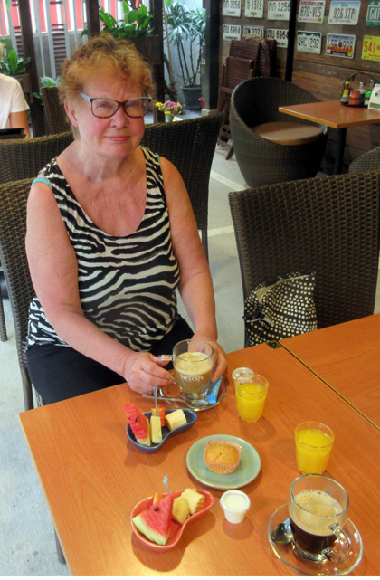 Aamuauringon keltaisessa valossa (verhomme ovat heleän keltaiset) eilinen pimeys oli musta muisto vain. Meillä on vaihteeksi ylellisesti huoneen hintaan sisältyvä aamiainen. Se tarkoittaa, että saamme valita erilaisista seteistä mieleisemme.