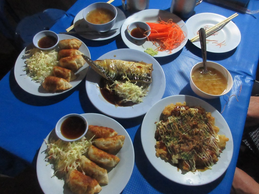 Valitsimme listalta misokeitot (vain 10b), annokset gyozoja, raputikkuja, paistettua makrillia sekä okonomiyakia. Lasku loistavasta illallisesta oli 190b eli noin viisi euroa. Kokemus oli muutenkin eksoottinen, sillä tällaisia annoksia emme olleet täällä ennen maistelleet.