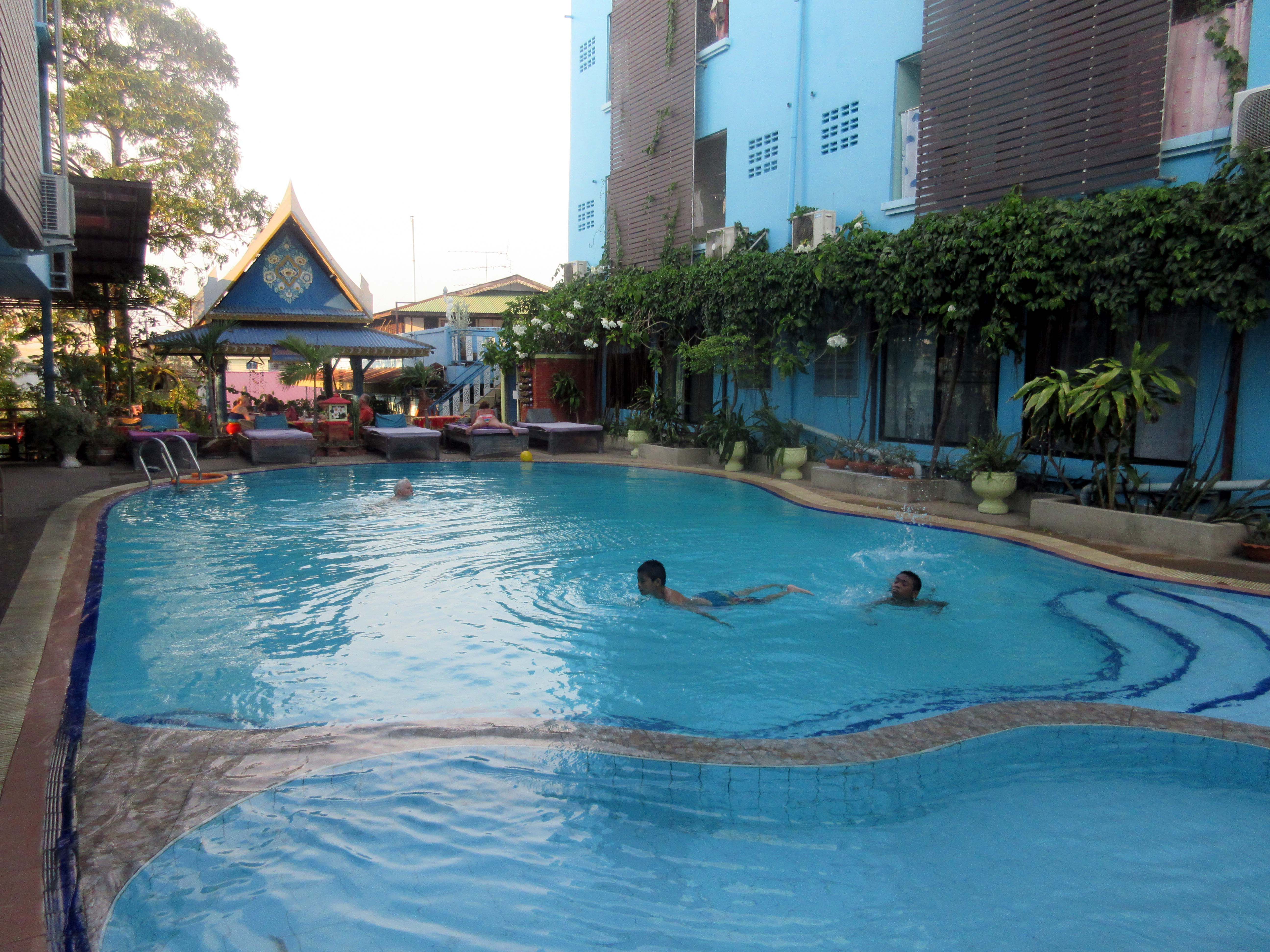 Istuimme auringonlaskun aikaan allasravintolassa ja nautimme kylmän oluen ja matkan viimeiset thairuuat. Valitsimme illalliseksi pelkästään herkkuja: tom yam keitto oli tulisen maukas, samoin papaijasalaatti. Jussi löysi listalta fish and chips annoksen. Hän halusi kaiken riisin ja nuudelinsyönnin jälkeen ranskanperunoita. Tuore kalafile oli paistettu rapeaksi, joten sekin oli hyvä valinta.