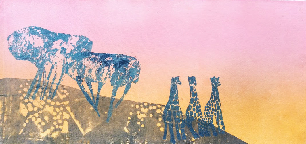 Nyt on. Sain ensimmäisessä lopputyösuunnitelman katselussa vinkin, että kannattaa tehdä jokaisesta työstä oma kokonaisuus. Niinpä en yrittänytkään saada yhteen vedokseen kokonaista viidakkoa tai savannia tai sirkusta, vaan keskityin tunnelmoimaan. Olin itse aika tyytyväinen, sillä liukuväritausta sitoi aiheen kokonaisuudeksi. Aikaisemmat työni näyttivät todellakin leikkaa-liimaa askartelulta. Tosin niitä oli hauska tehdä. Lämmin kiitos graafikkosisko Kukalle, joka opasti väriliukumiin.