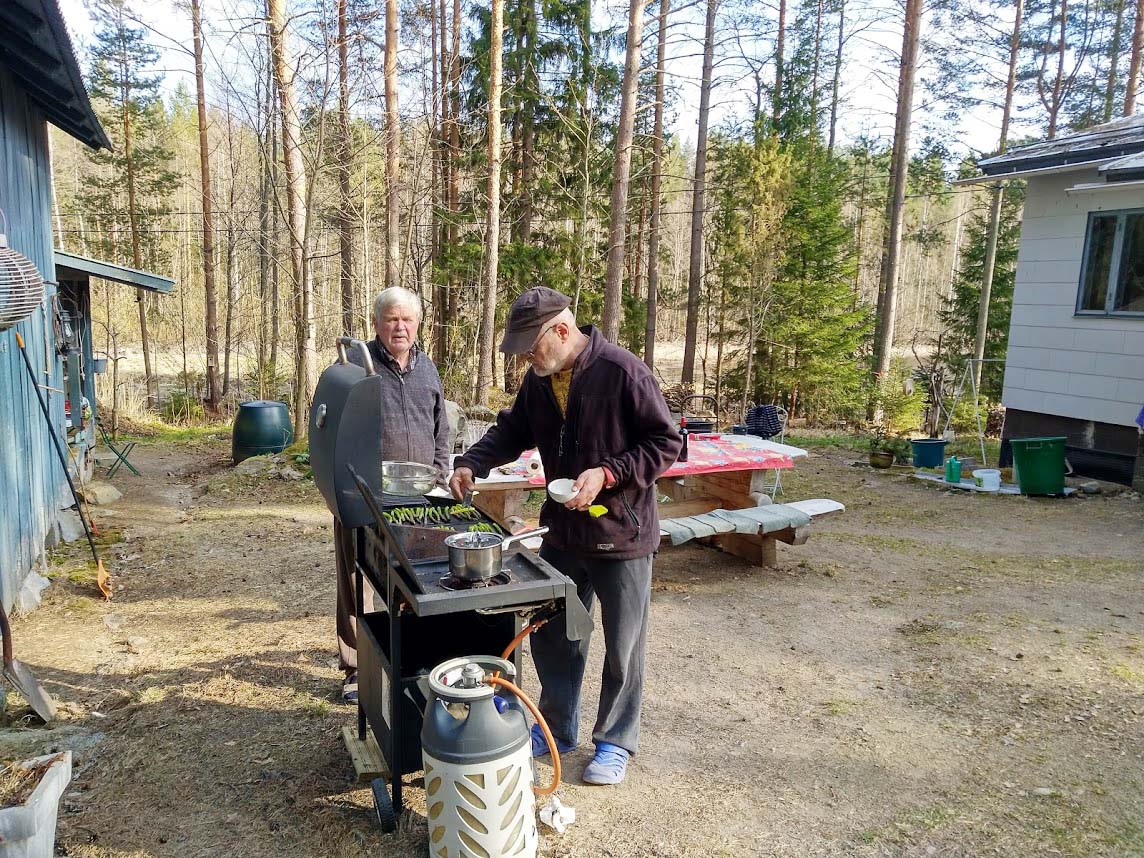 Vappu vuosimallia 2019 oli poutainen ja tuulinen. Ajoimme vappuaattona illan edellä ystäviemme Tertun ja Immon mökille Kuhmoisiin. Perillä meitä odotti herkkuillallinen. Kilistimme kuohuviinit ja nautimme sen jälkeen pöydän antimista.