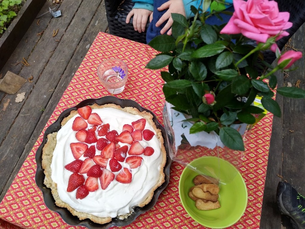 Näin tapahtui. Iltapäivällä oli luvassa sadetta. Keittelin termospulloon kahvit ja pakkasin torttupohjan mukaan. Koristelimme sen mökillä Otson kanssa.