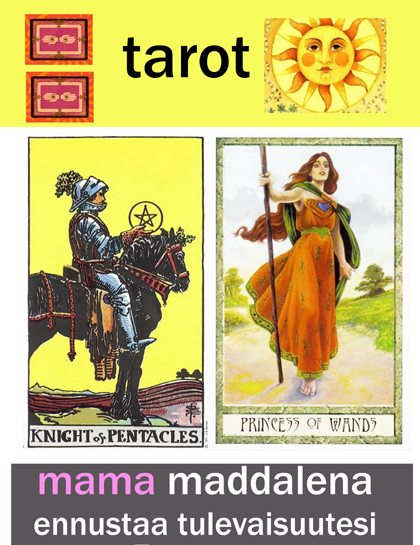– Taidan käydä antamassa neito Pohjantuulelle iltasuukon, prinssi Mikael tuumi juominkien jälkeen. – Minä käyn kiittämässä ennustajaeukkoani. Mama Maddalena oli jo ehtinyt odotella urhoa. – Kiitos, en olisi voinut toivoa parempaa ennustusta. – Mitä turhia, itsehän korttisi nostit. Mutta nyt poikaseni on unten aika. Kommipä peremmälle telttaani ja lämmitä hetki vanhoja luitani. Mama hihitti, puhalsi kynttilän sammuksiin ja veti teltan vetoketjun visusti kiinni. Hän oli nostanut itselleen onnenkortin. Se oli Miekkojen ritari. Kortit tietävät.