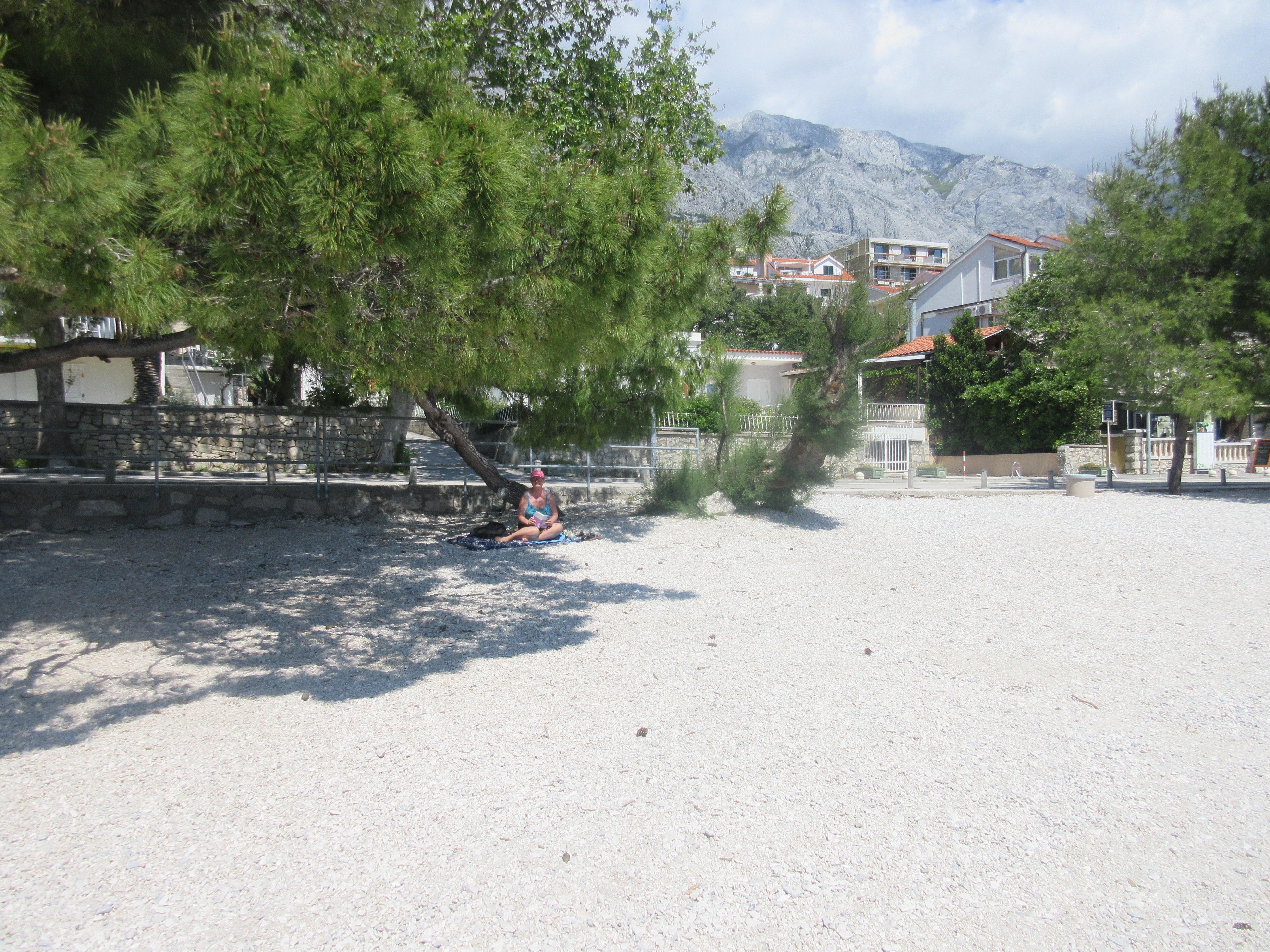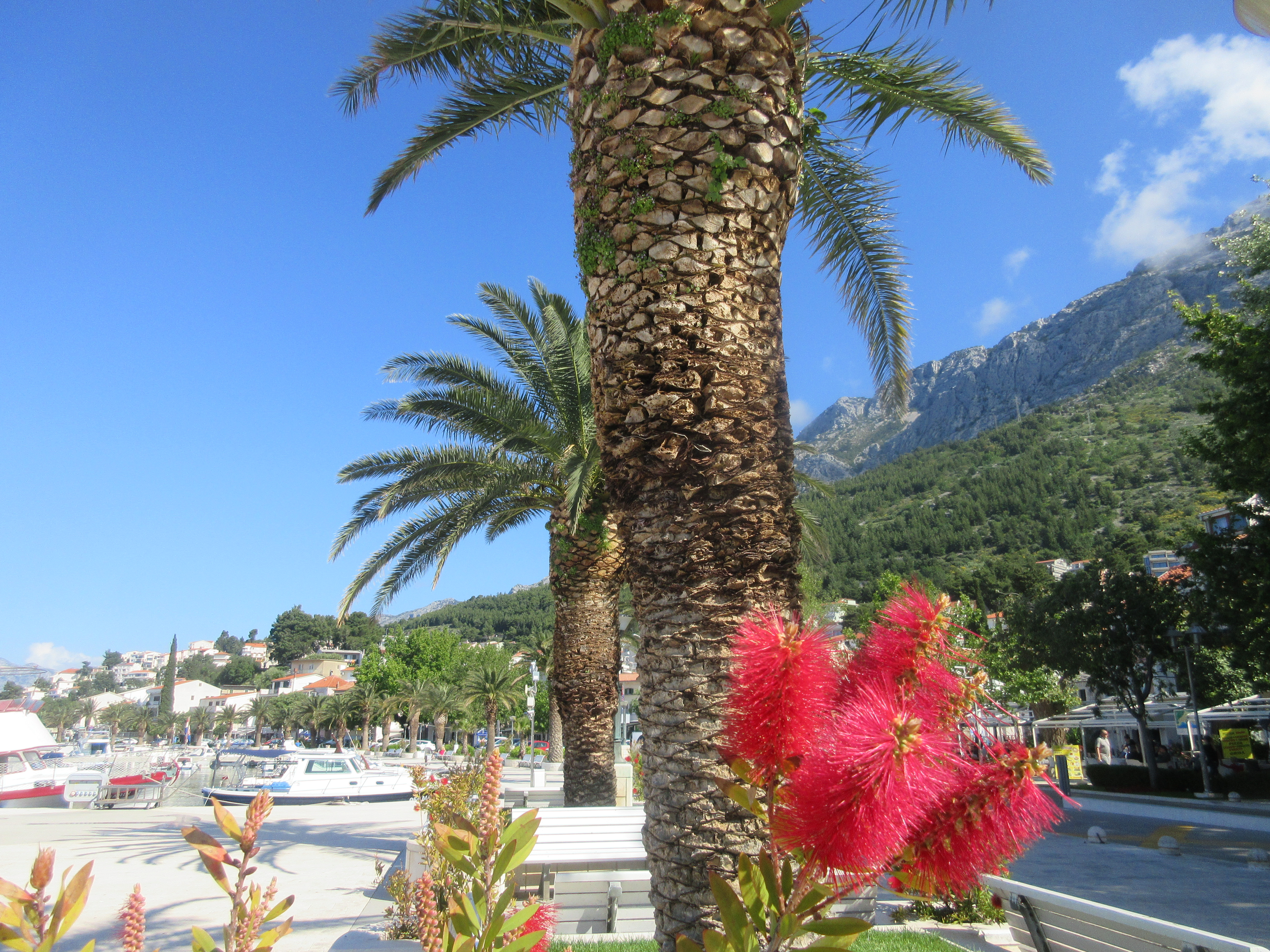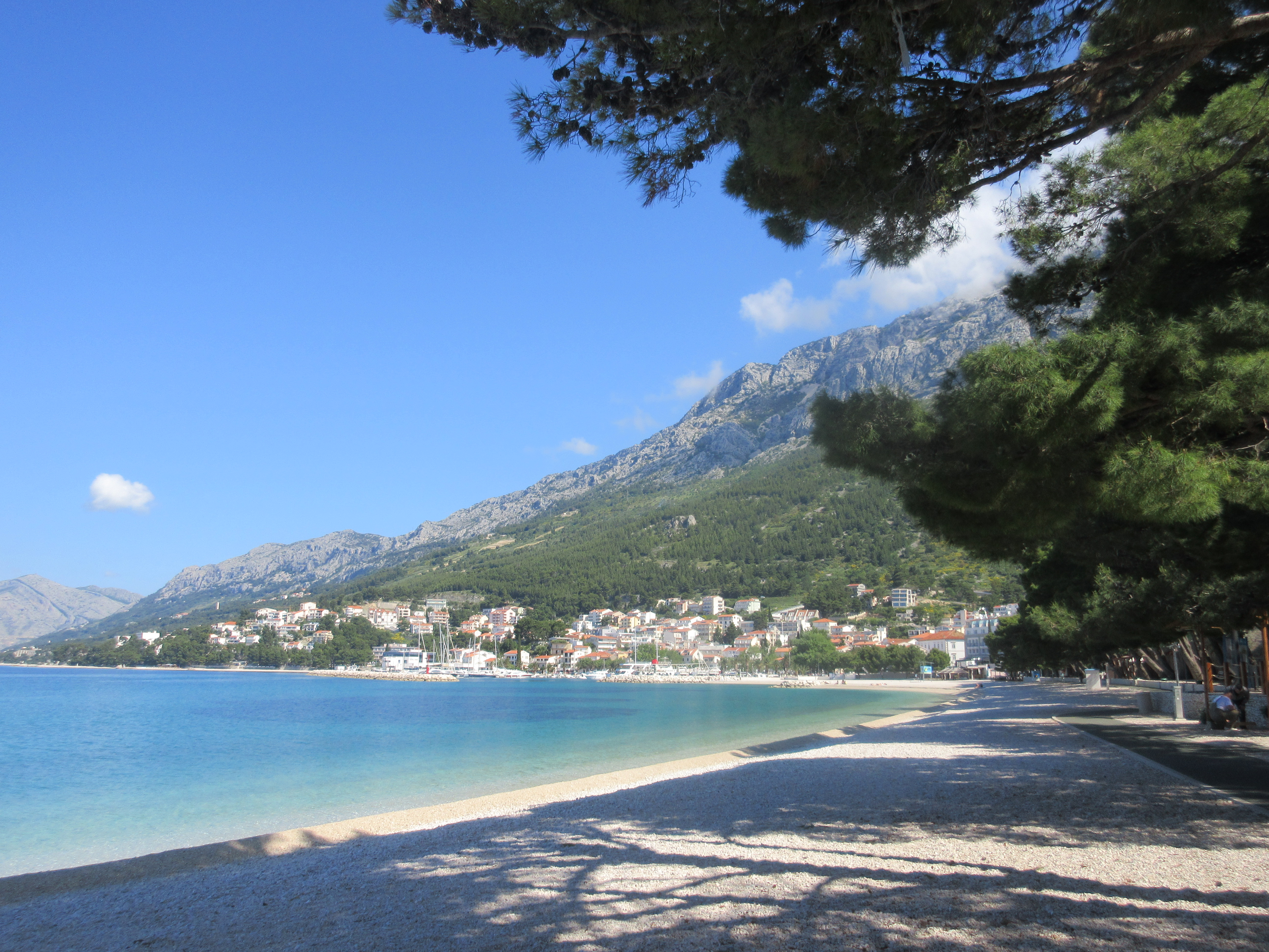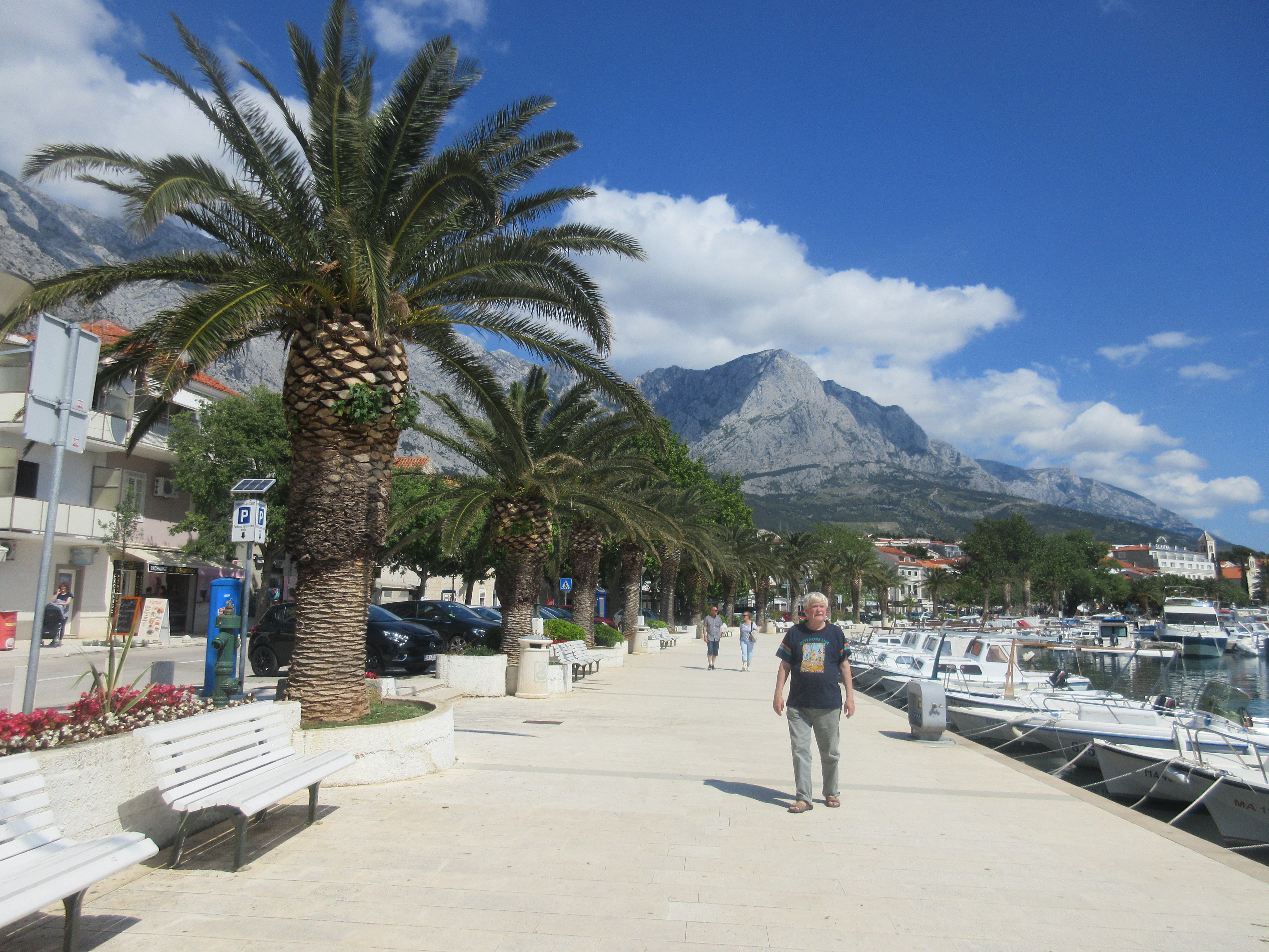 Palasin rantaa pitkin ja istahdin ensimmäiseen auki olevaan kahvilaan. Matkassa ei ollut vesipulloa, joten virkistys oli tarpeen. Paikka oli täpötäynnä aamuvirkkuja. Taisi olla joku seurue. – Saanko istua pöytääsi, komea herrahenkilö kysyi – ruotsiksi. Annoin luvan – englanniksi. Meillä oli mukava juttutuokio. Esittäydyimme, hän oli Per, opettaja. Mies oli kävellyt aamulla Brelasta ja aikoi jatkaa matkaa noin kymmenen kilometrin päähän Makarskaan.