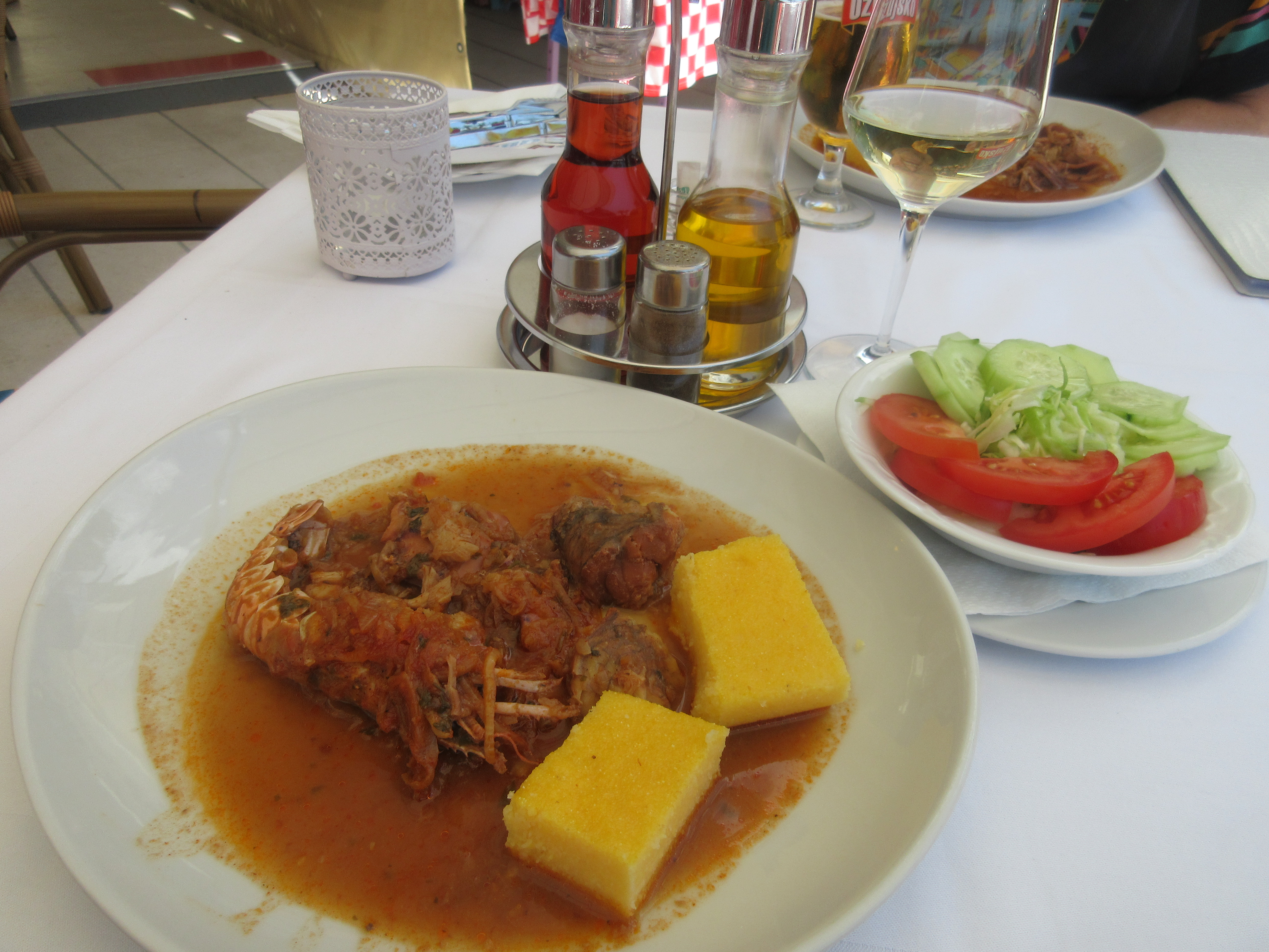 Tilasimme siis sellaiset ja saimme taas gourmet aterian. Annoksessa oli merikalaa, mustekalapaloja sekä grillattu jättirapu. Lisukkeena oli polentaa, joka ei kyllä maistunut millekään. Olimme tyytyväisiä. Hinta oli vain 35 kunaa, siis viisi euroa hengeltä.