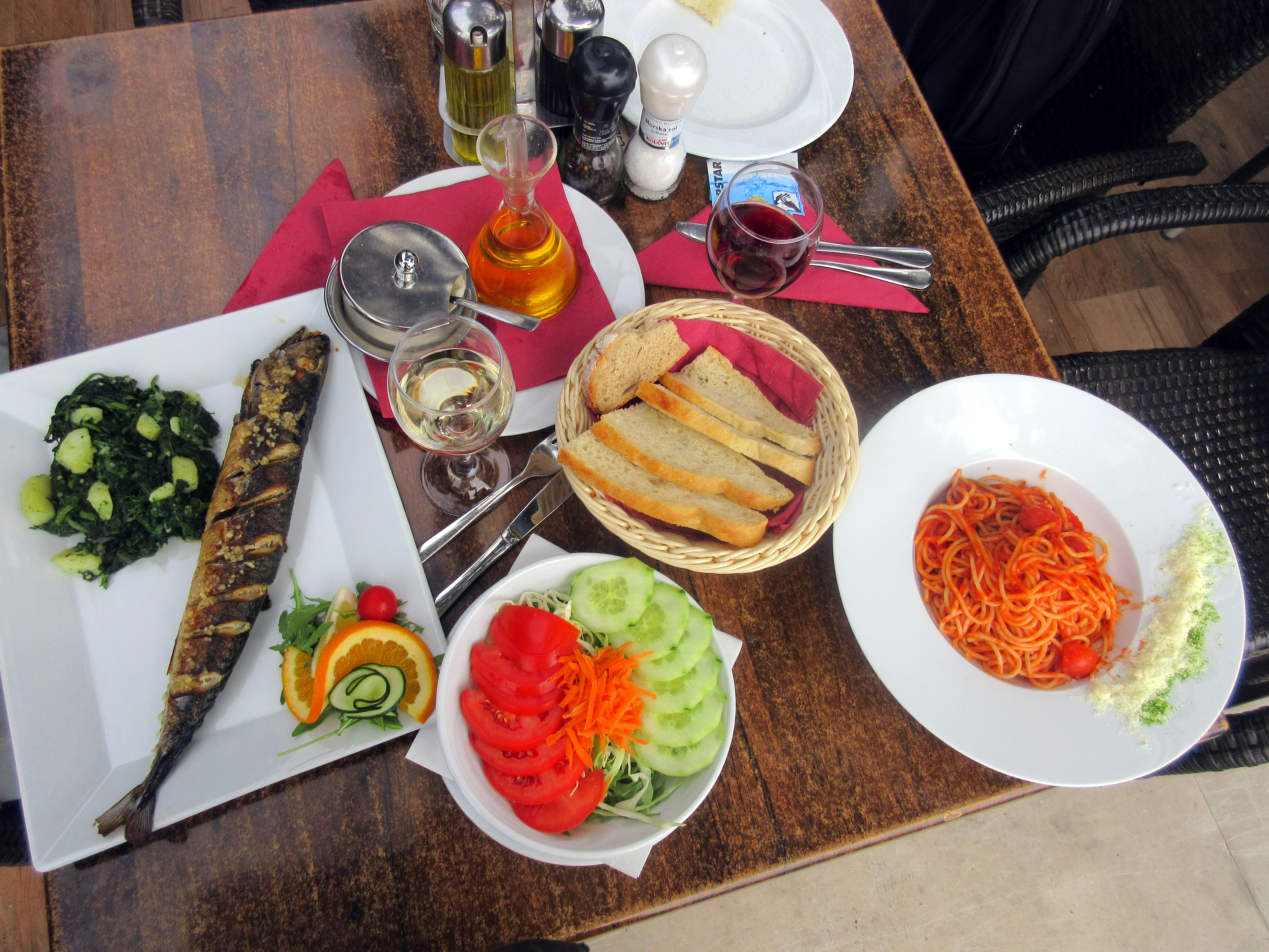 Tänään tilasin spaghetti arr’abbiatan rantaravintola Plazassa. Maku ei ollut ollenkaan niin makuhermoja hivelevä kuin aikoinaan Italiassa. Jussin grillattu makrilli sitä vastoin oli herkullinen. Runsas valkosipuli kruunasi annoksen. Perunat mangoldin kera on dalmatialainen erikoisuus. Hyvää kuin mikä. Kokeilen sitä kotikeittiössä, kunhan palaamme.