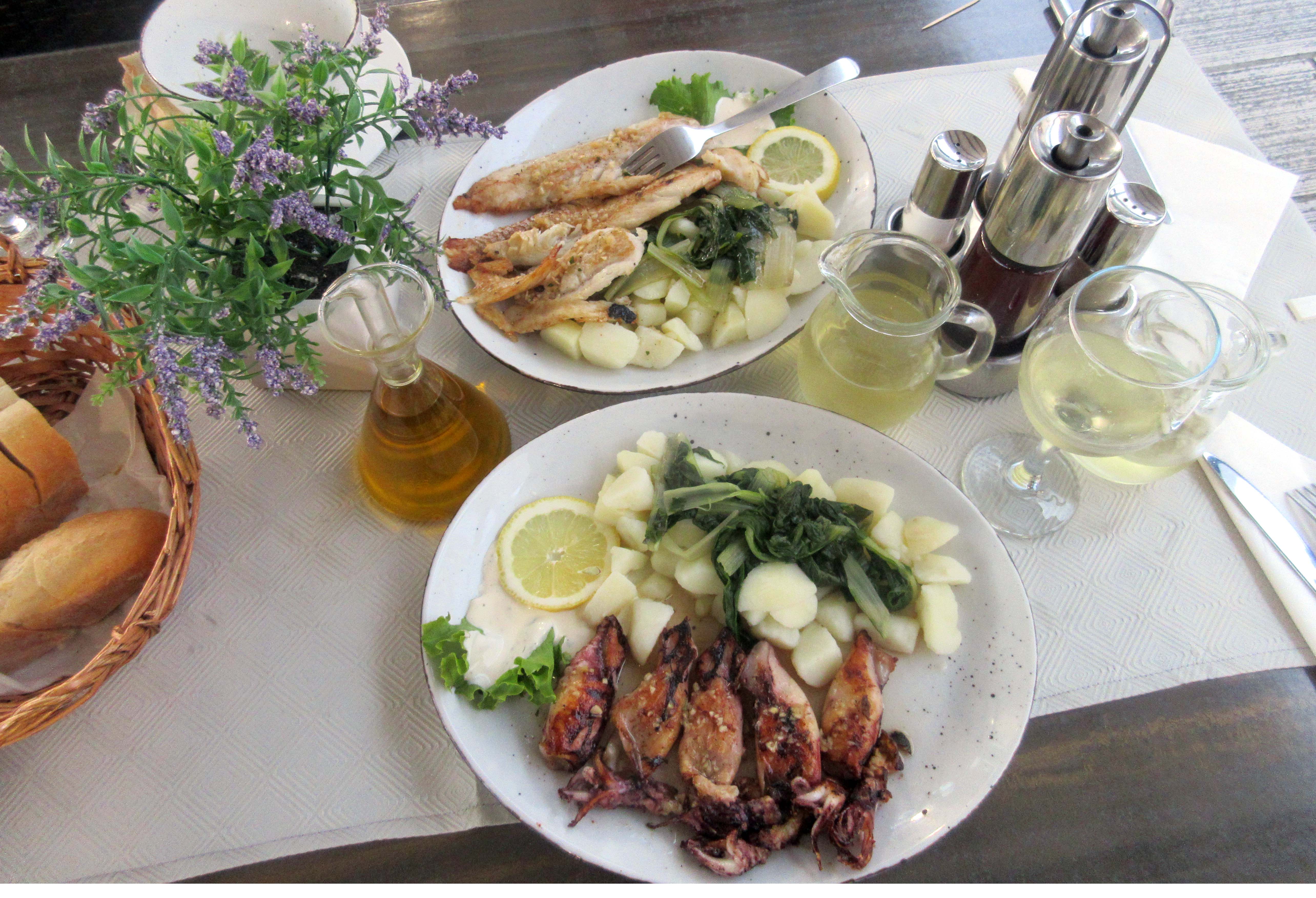 Nautimme viimeisen lomapäivämme illallisen rantaravintola Victoriassa. Minä herkuttelin vielä kerran grillatuilla mustekaloilla. Jussi valitsi listalta seabass-merikalan fileen. Olimme hyvin hyvin tyytyväisiä makuihin.