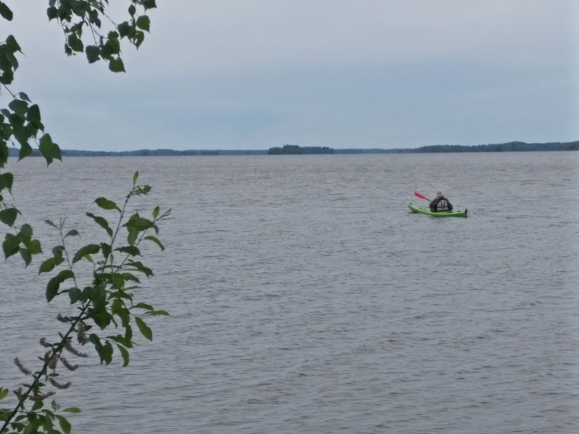 Sehän sopi. Vieraiden tulo sai meihin vauhtia. Lähetin Jussin Parolaan kauppaan pitkän ostoslistan kanssa. Siivosin pikaisesti pihapiirin. Syöksyin sen jälkeen pakkauslaatikoiden kimppuun etsimään astioita. Löysin lautaset (olemme syöneet tähän asti muovilautasilta) ja lasit ja tarjoilukulhot. Kauppamies ja vieraat saapuivat lähes yhtä aikaa. Immo oli melonut Ruskeenkärkeen, joka oli yksityisaluetta. Hän sai luvan rantautua. Terttu ajoi paikalle ja vieraat saapuivat kajakki auton katolla mökkipihaan.