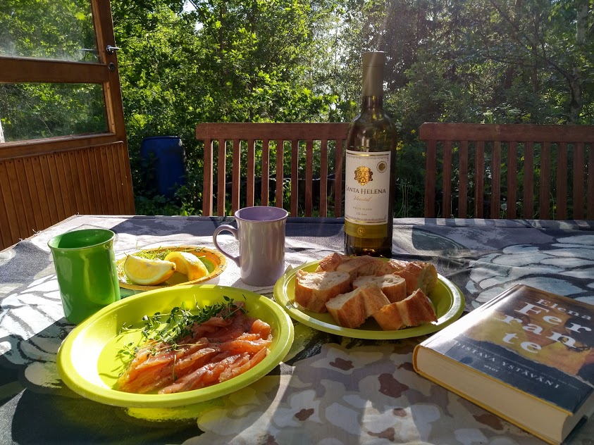 Tarjosin meille iltapalaksi tuoretta patonkia ja Jussin edellisenä päivänä graavaamaa lohta. Juhlistimme kesäkauden avajaisia kylmällä valkoviinillä. Lasit olivat vielä jossain pakkausten keskellä. Kyllä viiniä voi juoda mukeistakin, totesimme. Hyttyset olivat heränneet. Siirryimme aika pian suosiolla sisälle takkatulen ääreen.