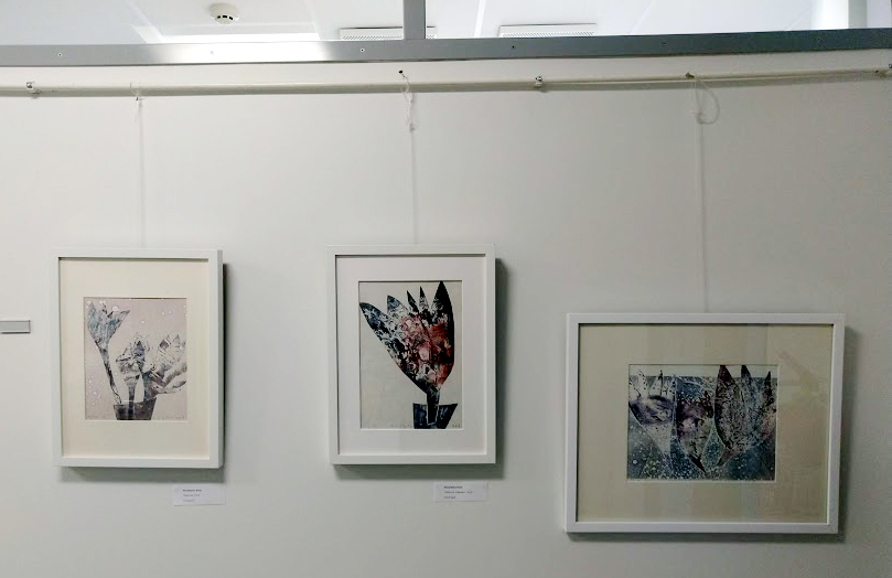 Oli ihan pakko käydä katsomassa kirjstossa, miten graafikkosiskot olivat ripustaneet kesänäyttelymme. Minulla on siellä esillä neljä vedosta. No, väljemminkin olisi voinut laittaa työt esille. Olen kuitenkin ylpeä, että saan olla mukana taitavien graafikoiden hyvässä seurassa.