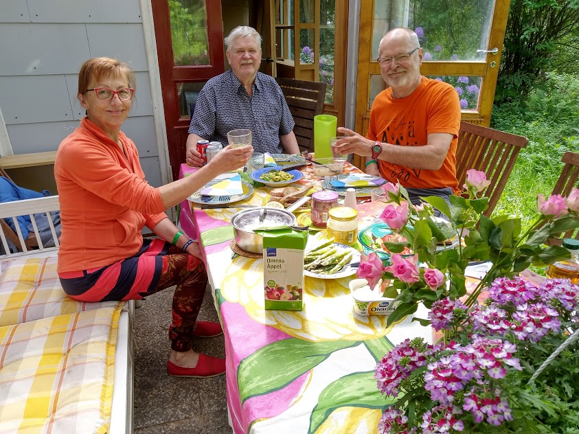Kokkasimme yhteisvoimin lounaan. Keittelin kattilallisen varhaisperunoita, Immo kuori parsat, Terttu teki salaatin ja Jussi kantoi juomia pöytään. Ilma oli viileä mutta onneksi tyyni. Tarkenimme syödä ulkona. Pannukahvien jälkeen kesävieraat jatkoivat matkaa. Heillä oli vielä parin päivän melontaurakka edessä.