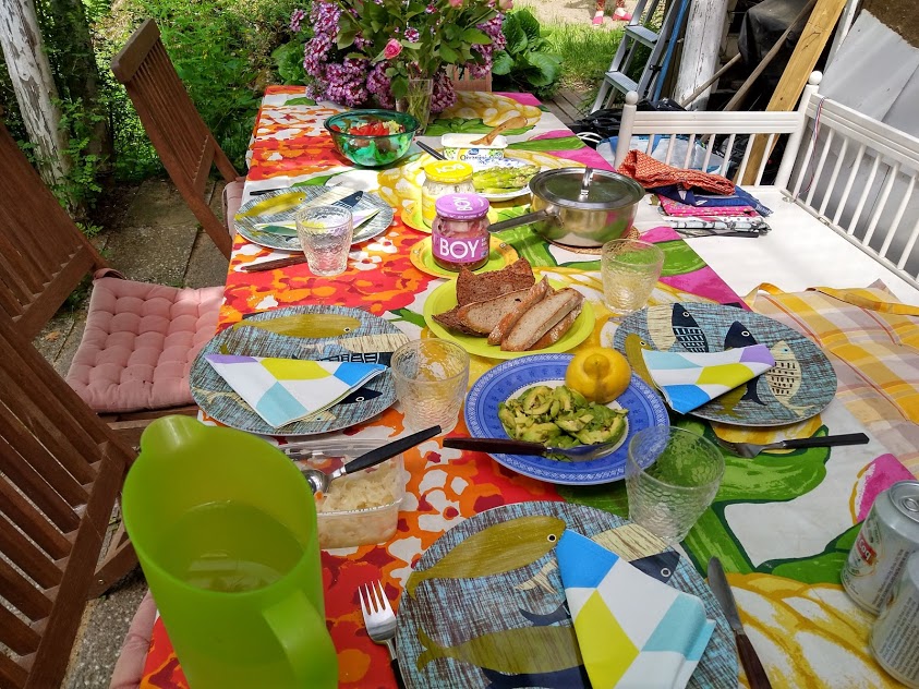 Mökillä on kaaos. Tavarat on muuttolaatikoissa talven remontin jäljiltä. Olen ehtinyt kaivaa esille jo keittiön, makuuhuoneen ja vessan. Mitä muuta ihminen tarvitsee? Silmä on tottunut tavarakasoihin. Ulkopöytä on käytössä ja pihakeinulle voi vetäytyä aina kun aurinko paistaa.