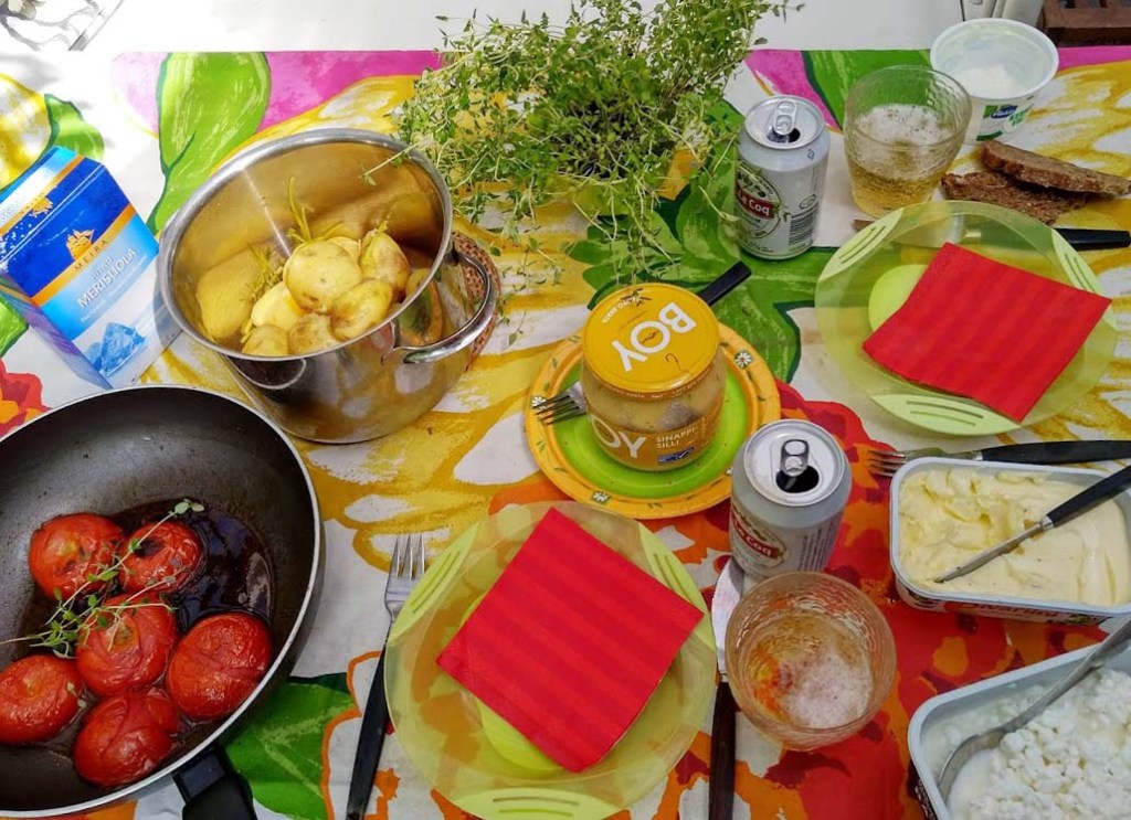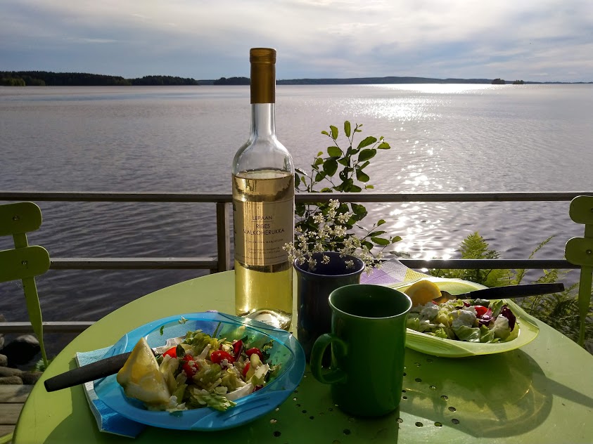 Kesän parasta antia on istua iltaisin rantakeinulla. Kannan sinne retkieväät. Salaatit ja kylmä valkoviini maistuvat lämpimien päivien jälkeen.