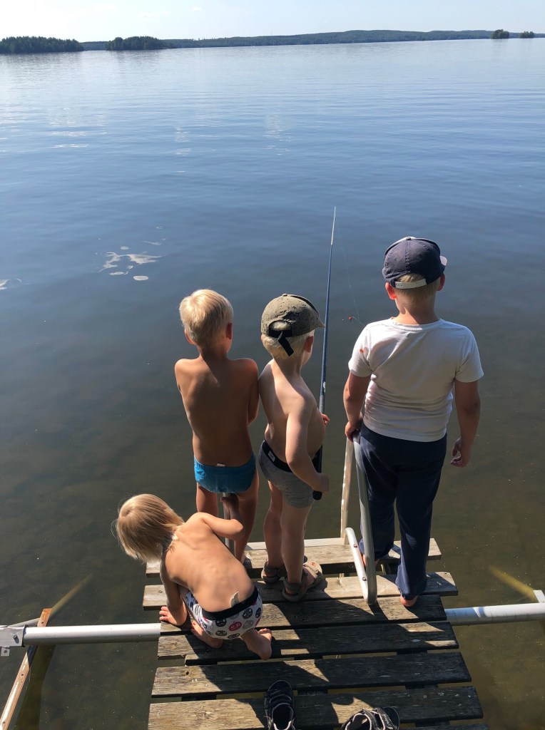 Päivän kohokohta oli onkiretki laiturille. Samu nappasi ahvenen. Paistoimme sen illalla.