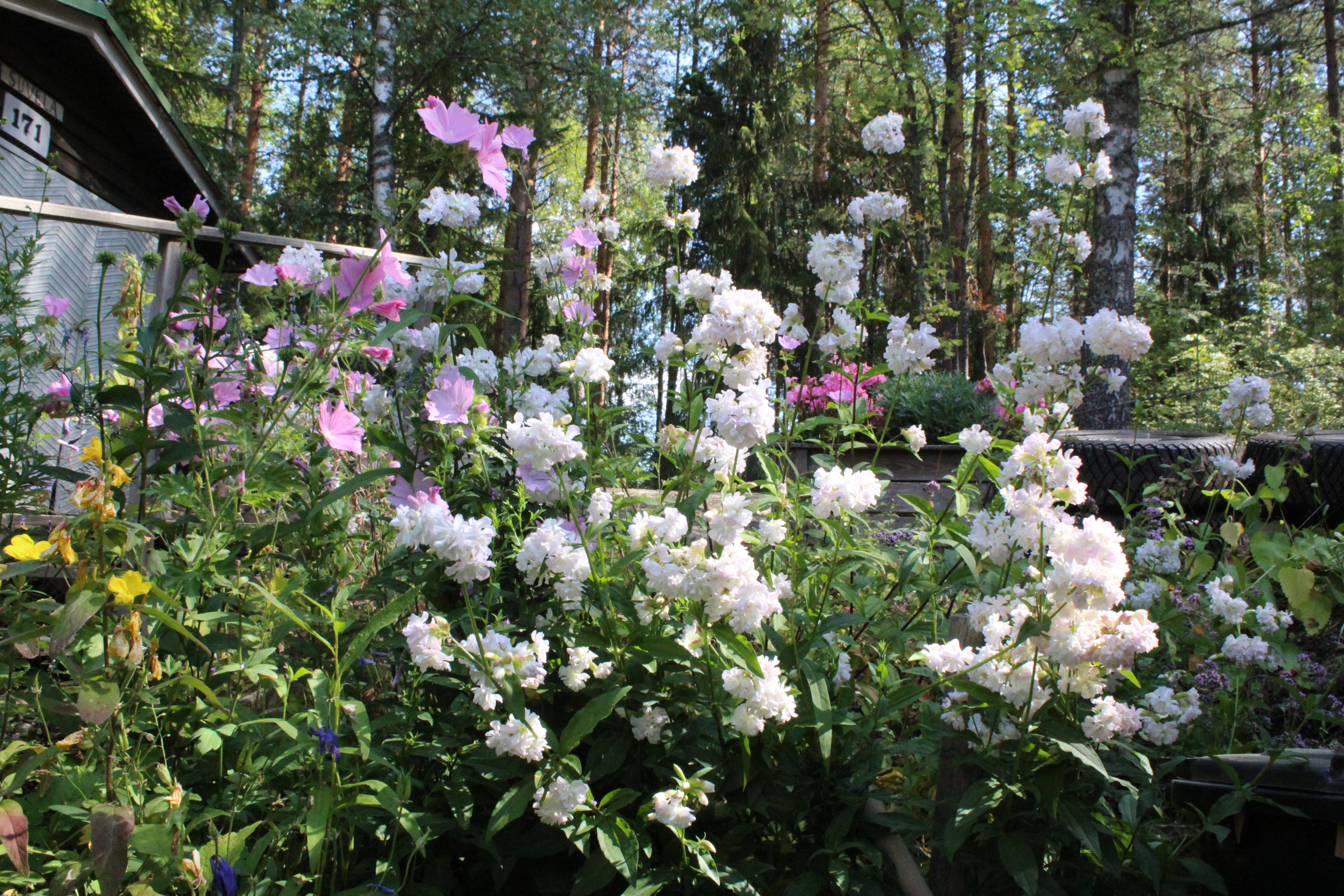 Mökkipiha kukoistaa. Kesäkukat ovat parhaimmillaan. Sadetta kaivataan.
