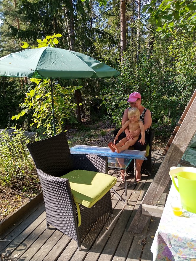 Iltapäivisin pihakeinulla on ollut niin kuuma, että siellä ei voi olla. Ei, vaikka aurinkovarjo on levitetty. Ensi viikoksi on luvassa viilenevää. Merkillinen kesä. Järven pinnalla on levää. Minä olen toista viikkoa uima- ja saunakiellossa luomenpoiston jälkeen.