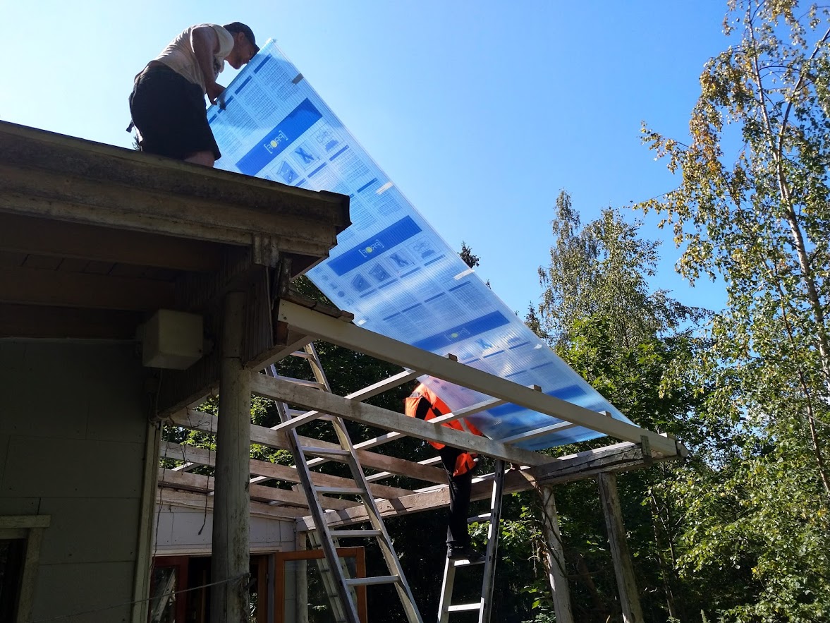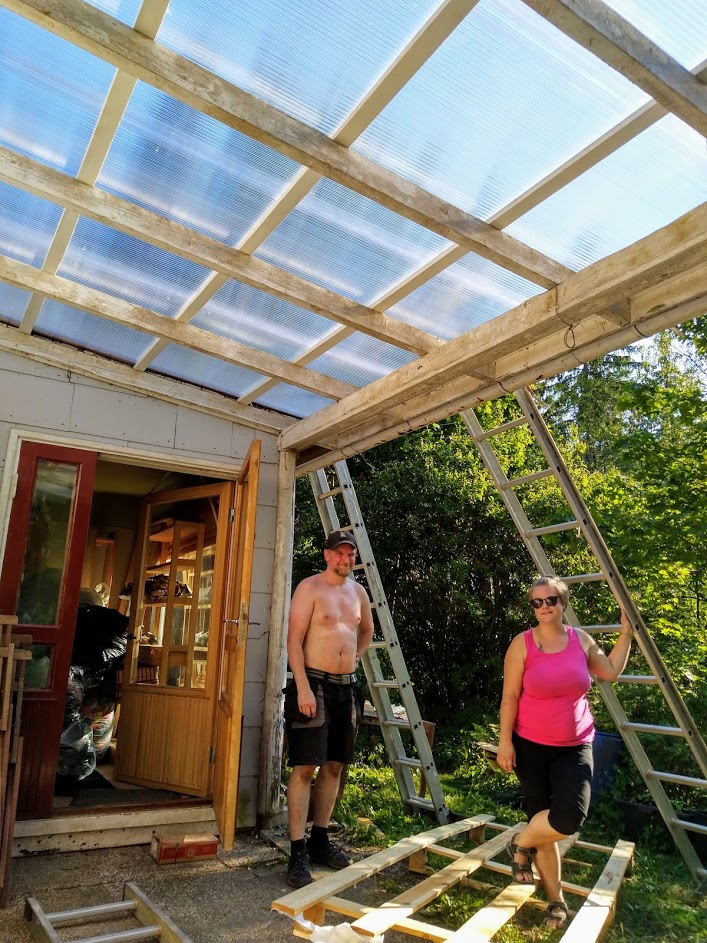 Meillä oli kattotalkoot. Miika ajoi aamulla Espoosta hommiin. Hän ja kirvesmies Pekka aloittivat urakan reippaasti.