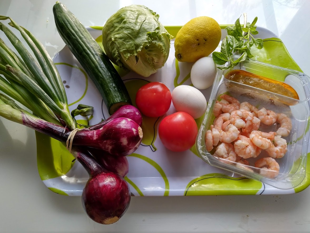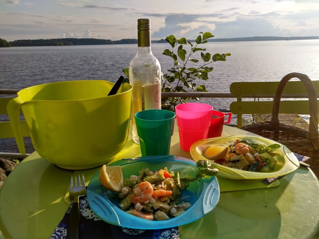 Mökin pakastimesta löytyi pussillinen jättirapuja mangocurry-dipin kera. Keitin pari kananmunaa ja pilkoin rapeaa jäävuorisalaattia. Lisäsin vähän punasipulirenkaita ja tomaatinlohkoja. Maustoin yrttisuolalla, sitruunanmehulla ja oliiviöljyllä.