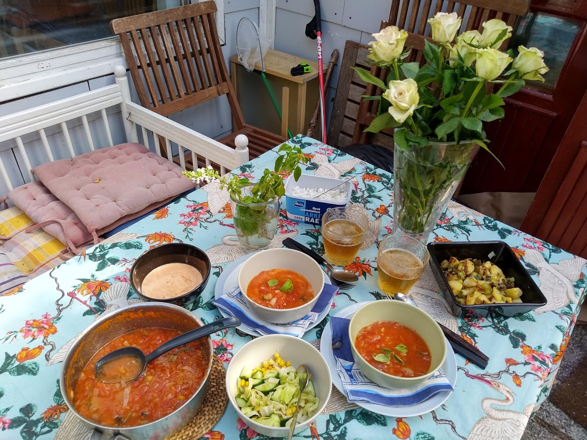 Kesäruokailu mökillä on tapahtunut lasten ehdoilla. Kun nyt heinäkuun lopulla olemme vapaalla, kokkasin pitkästä aikaa omia herkkujamme. Tomaatit ovat kypsiä, makeita ja edullisia. Kalttasin ne ja kiehautin tuoreen punasipulisilpun kera kasvisliemessä. Maustoin timjamilla, basilikalla ja valkosipulilla. Maku oli lempeä.