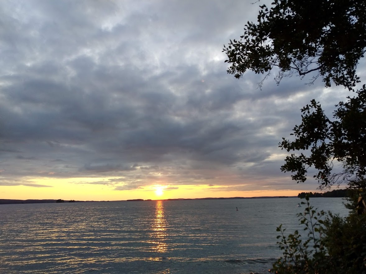Kun meno oli villeimmillään, pakenimme Jussin kanssa saunamökille. Oli ylellistä istua rantakeinulla katsomassa auringonlaskua. Nyt mökillä on taas rauha, sillä olemme viikon kahdestaan vetämässä henkeä. Ensi viikonloppuna on tiedossa Otson syntymäpäiväjuhlat Espoossa ja Elomessut Hämeenlinnassa.