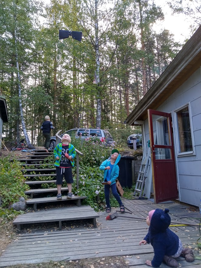 Samulla oli drone. Helikopteri pörräsi pihassa ja jäi välillä keikkumaan tammen oksille.