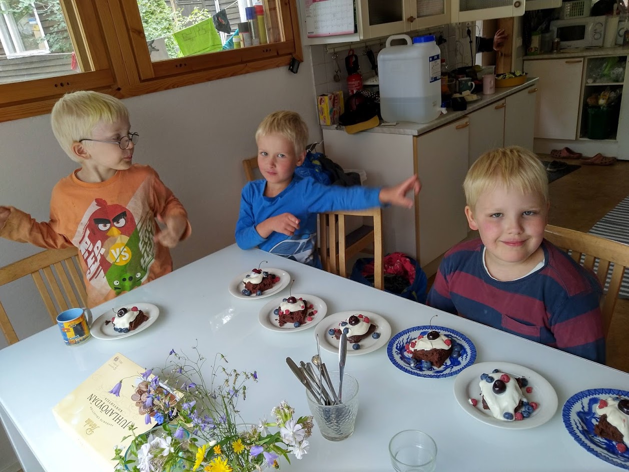 Herkkusuut tyhjensivät herkkukaapin. Anna leipoi suklaakakkupohjan. Hän täytti palat vaniljavaahdolla ja tuoreilla marjoilla. Nam, sanoivat pojat.