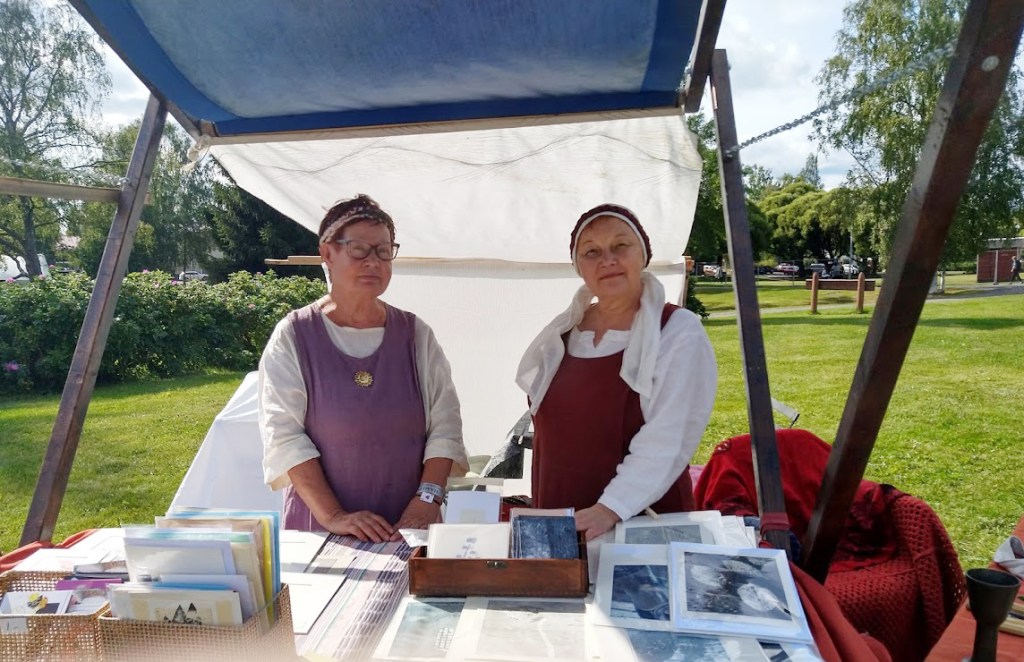 Perjantaina saimme iltapäivällä muutaman sadekuuron niskaan. Meillä Paperihuoneen graafikoilla oli myynnissä taidegrafiikkaa. Ne eivät pidä kosteudesta. Kaikki olivat muoveissa, vaikka keskiaikaa elettiin.