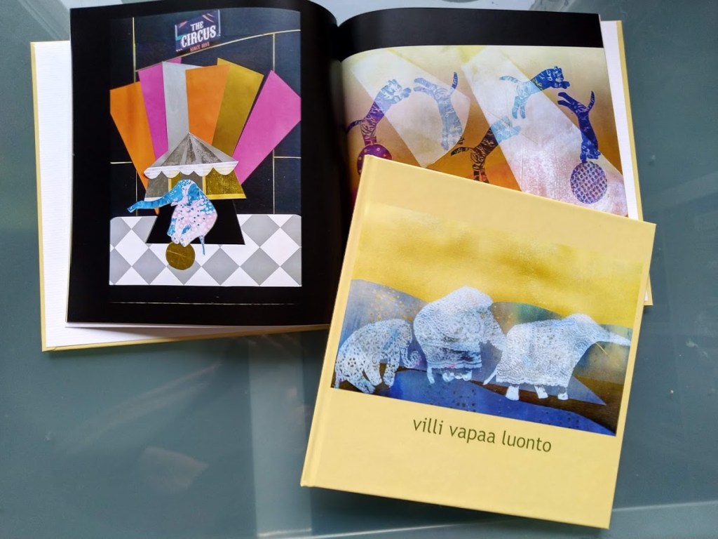 Niin ja bonuksena askartelin kuvakirjan eläinaiheistani. Se ei ennättänyt valmistua avajaisiin. Nyt kirja on esillä näyttelytilassa ja jatkossa selailukappale löytyy Paperihuoneelta.