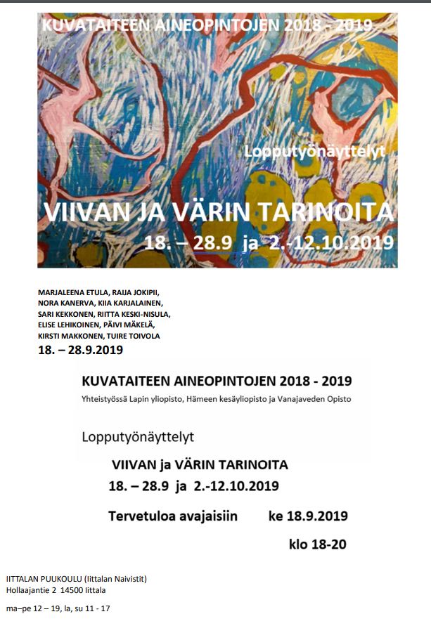 Juhlimme keskiviikkona 18.9.2019 Kuvataiteen aineopintojen lopputyönäyttelyn avajaisia Iittalassa Naivistien tilassa. Koska opiskelijaryhmämme vahvuus on 19 henkeä, näyttelyjä on kaksi. Olen mukana niistä ensimmäisessä.