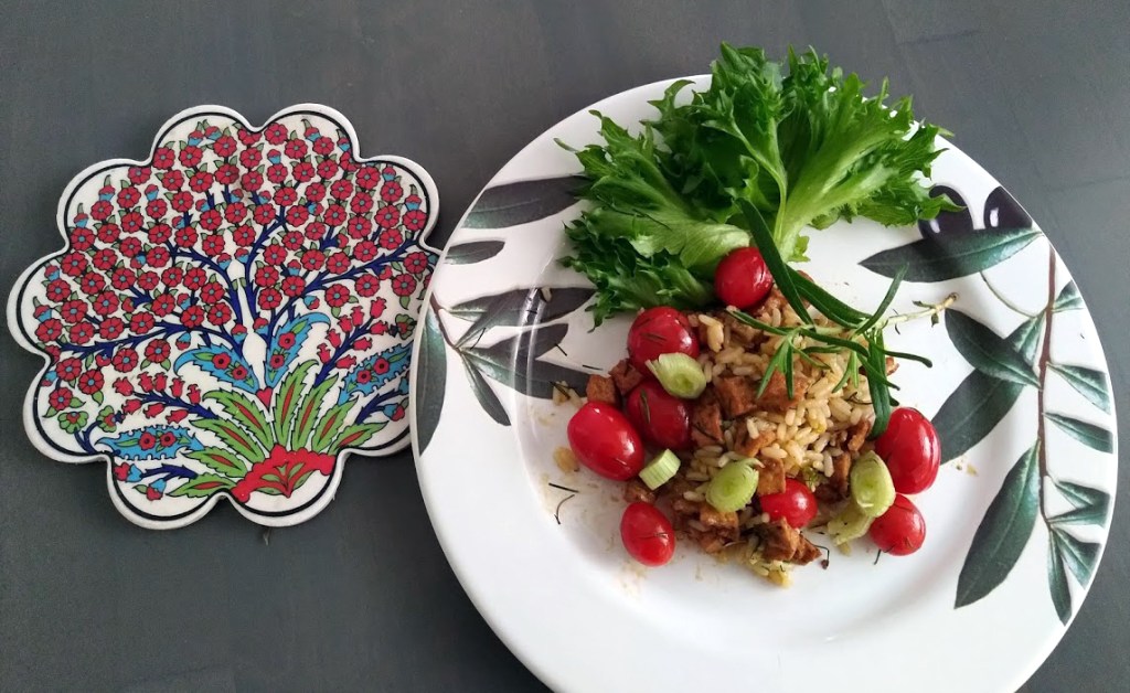 Kuumensin pannulla tuoretta sipulia, minitomaatteja ja riisiä. Sekoitin joukkoon tofukuutiot ja yhden kananmunan. Maustoin soijakastikkeella ja sitruunapippurilla sekä tilkalla chilikastiketta. Tuoretta tilliäkin ja rosmariinia löytyi. Maku oli kerrassaan herkullinen ja mikä parasta, annos valmistui muutamassa minuutissa.