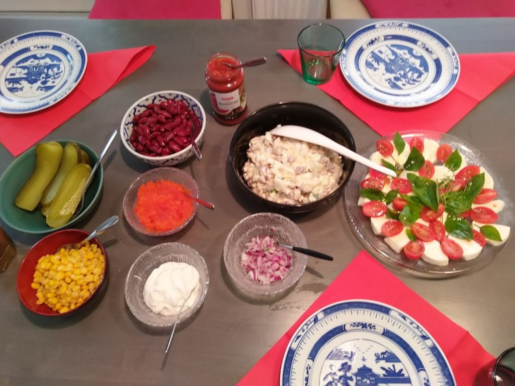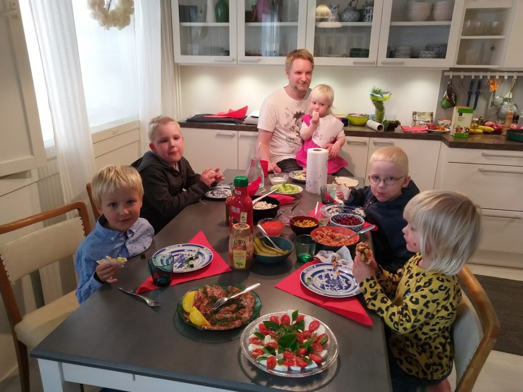 Blinit maistuivat aikuisille asianmukaisten lisukkeiden kera. Jussi graavasi lohta, joka oli juuri sopivan suolaista. Minä kokkasin tuoreista karvalaukuista metsäsienisalaatin.