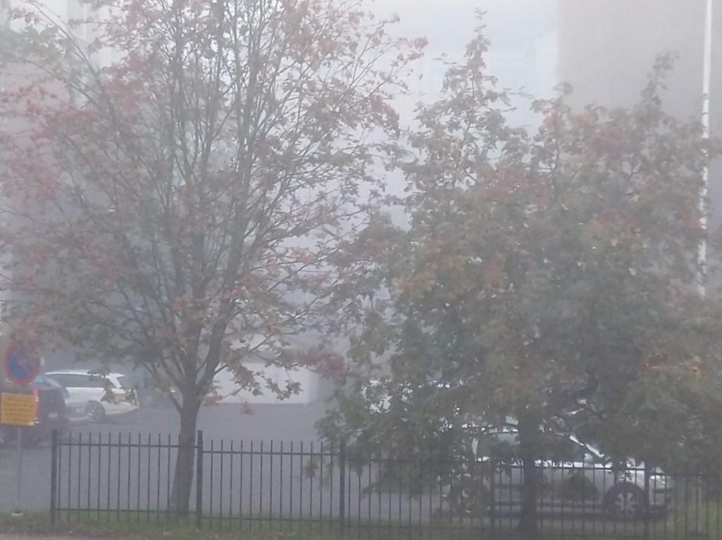 Aamulla herätessäni maisema oli kadonnut. Toivottavasti se selkiytyy siihen mennessä, kun on aika lähteä Iittalaan päivystämään näyttelyä.