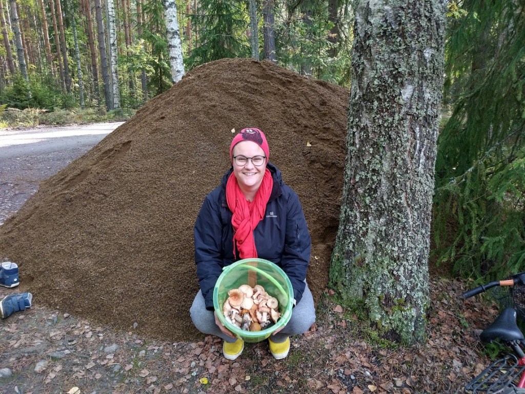 Anna ja pojat kävivät sienimetsässä sillä välin kun minä kokkasin perunoita ja jauhelihakastiketta. Jussi paistoi muurikalla lohta. Kaikki maistui punaposkisille sienestäjille.