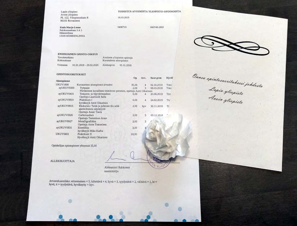 Todistus saapui sateisena lokakuun päivänä. Sain aikanaan Alfa-Art taidekoulusta yleisarvosanan 4 (asteikolla 0-5). Niin näistäkin opinnoista. Olen siihen äärettömän tyytyväinen.