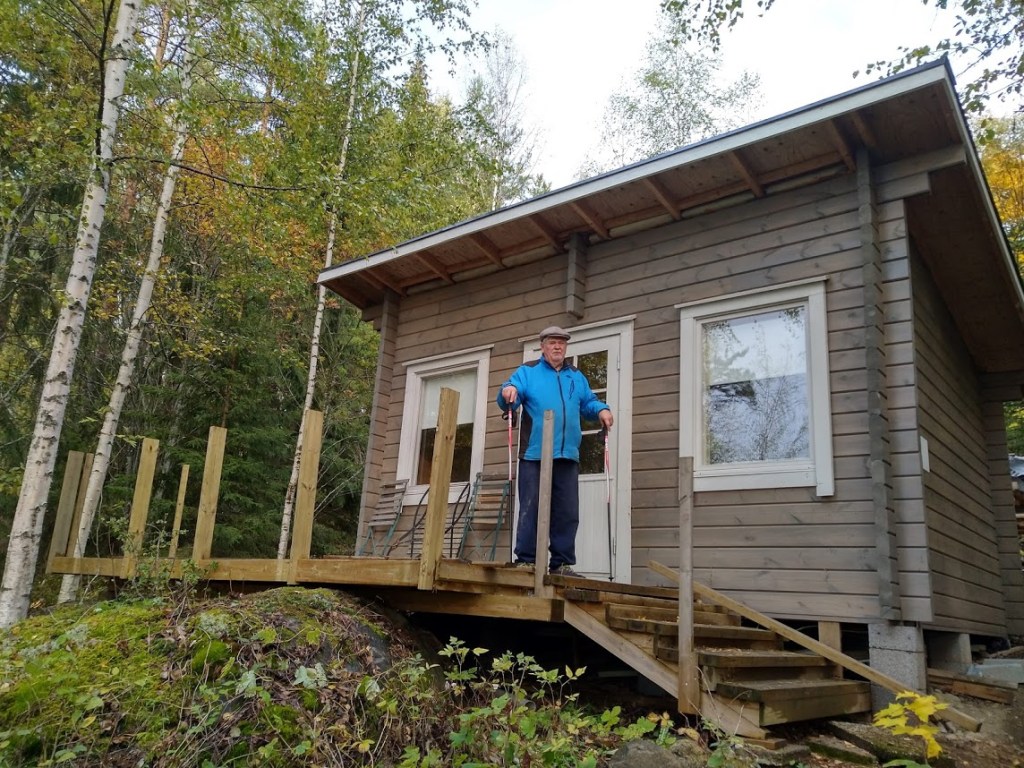 Tarkastimme, mitä kirvesmiehemme Pekka oli saanut aikaan välimökin verannalla. Syksyn urakkana on saada aikaiseksi tukeva kaide ja kunnon portaat. Homma on hyvällä alulla.