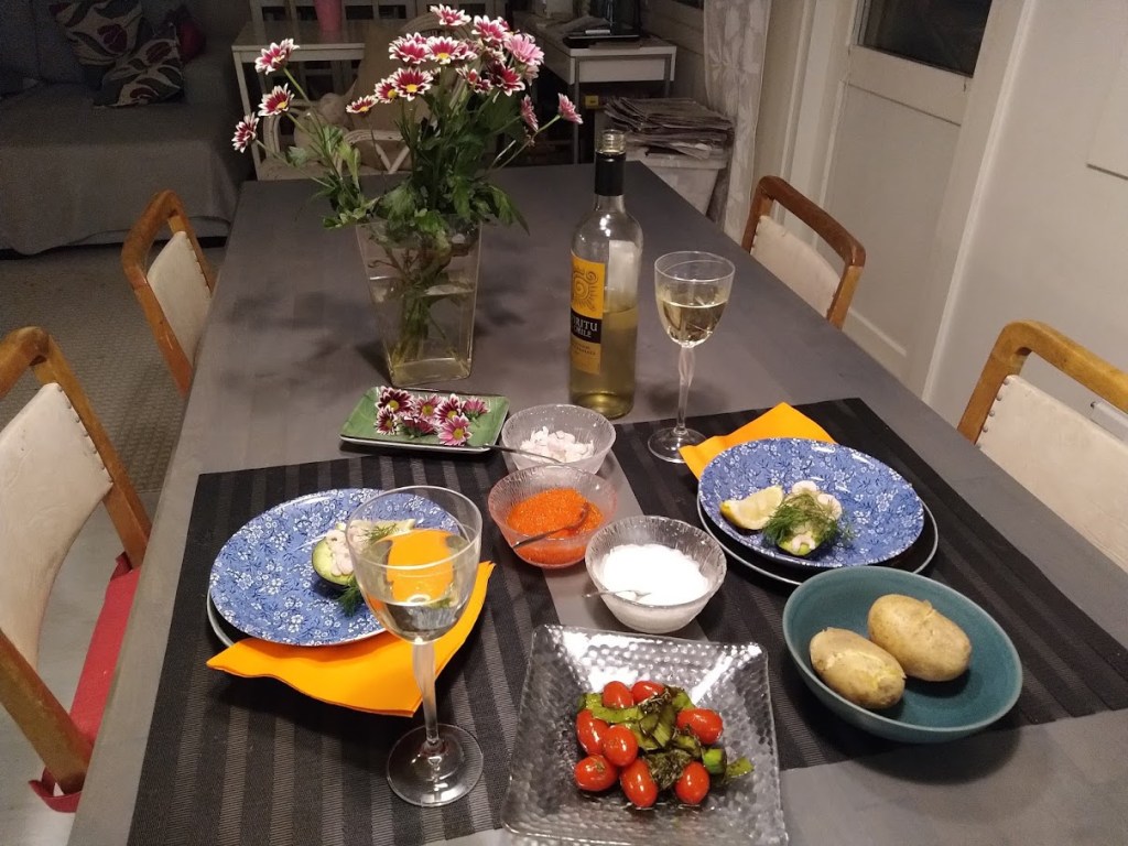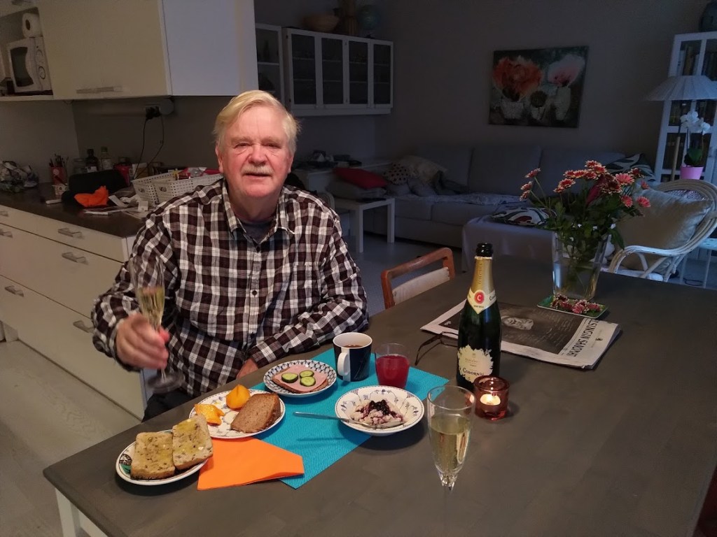 Aamulla katoin brunssin. Ainekset olivat arkisia. Kahvia, puuroa, sämpylöitä. Juhlavaa oli pala piimäkaakkua (omatekoista), khaki-hedelmä ja Annan punaherukkamehu sekä tietysti kuohuvat maljat.