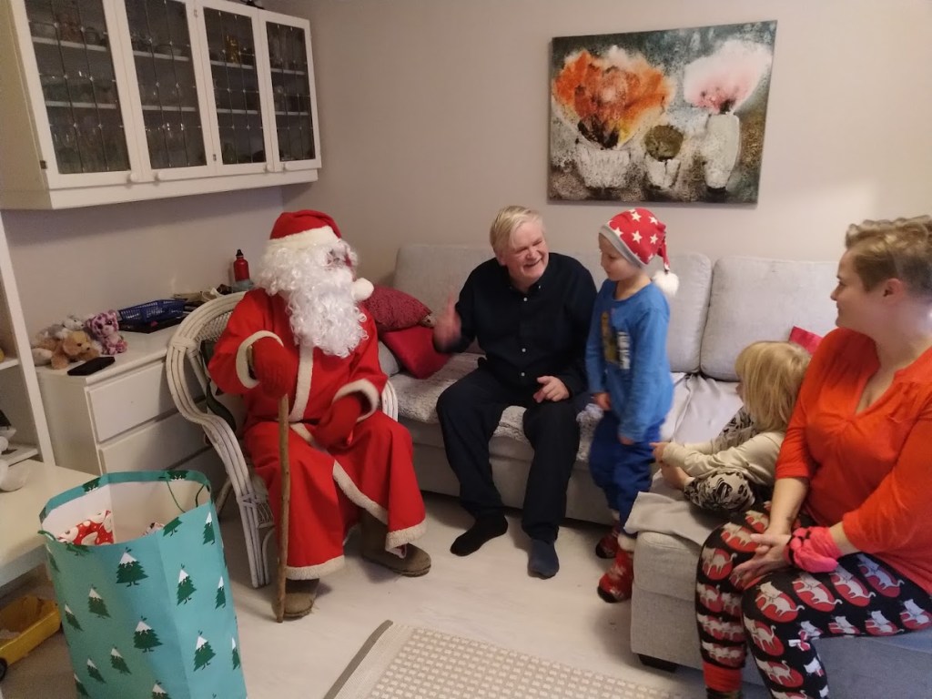 Pojat olivat täpinässä, kun joulupukki tuli. Lauloimme porukalla Soihdut sammuu ja pukki jututti poikia. Mistä hän tiesikin kysellä uimakoulusta ja peliharrastuksista.