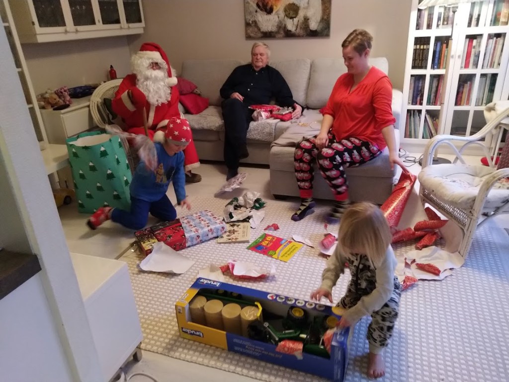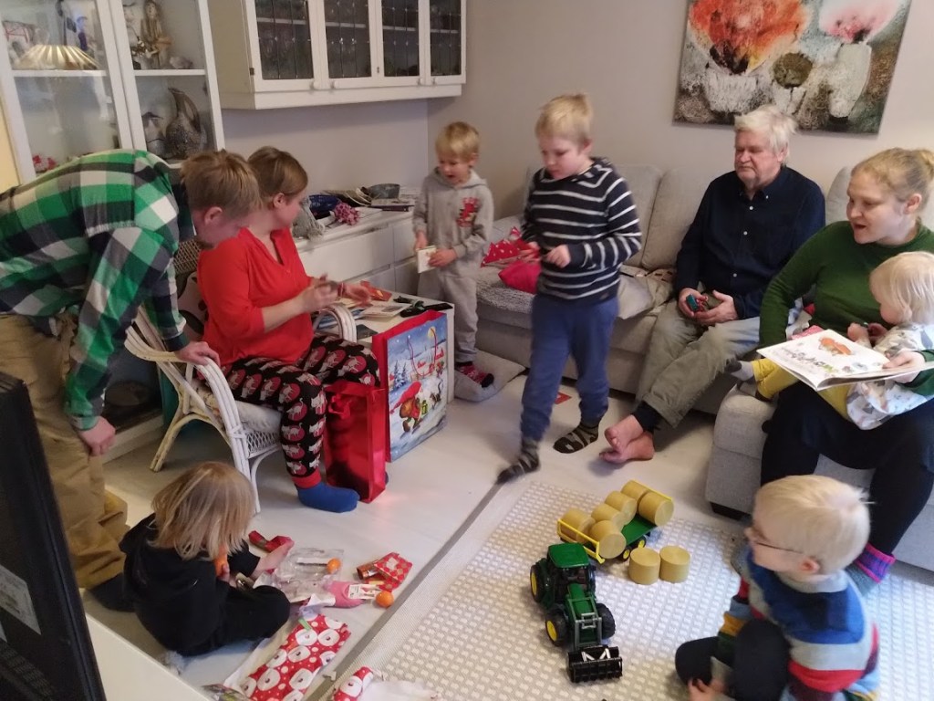 Samu ja Miska olivat vauhdissa, kun tuli aika jakaa lahjapaketit. He malttoivat hädin tuskin osallistua lauluun Kiitos pukki, tule vielä toiste.