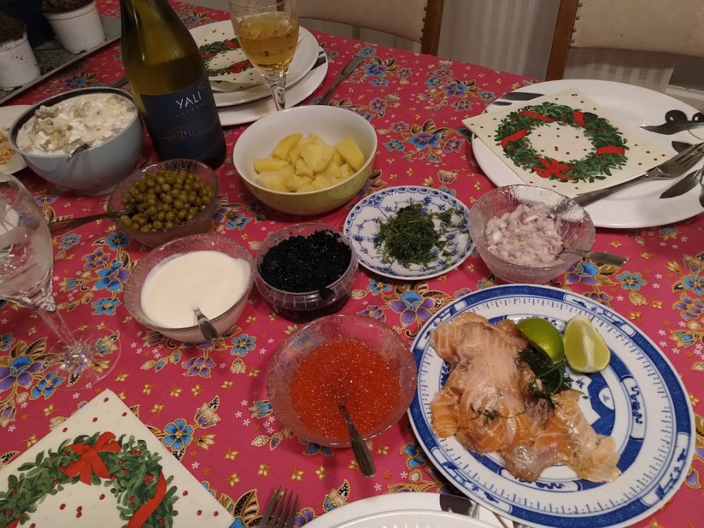 Joulupöytämme oli hyvin perinteinen. Aluksi tarjolla oli Jussin graavilohta ja kirjolohenmätiä punasipulin ja smetanan kera, sitten laatikoita, metsäsienisalaattia, haudutettua punakaalia, purkkiherneitä ja kalkkunarulla.