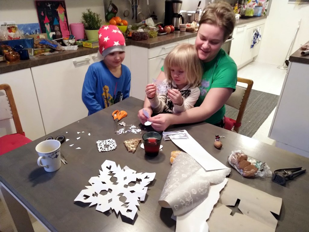Joulu 2019 on musta. Lumiukkoja näkyy vain lasten aattona taiteilemissa joulukoristeissa. Aamulla syntyi myös upeita paperitähtiä.