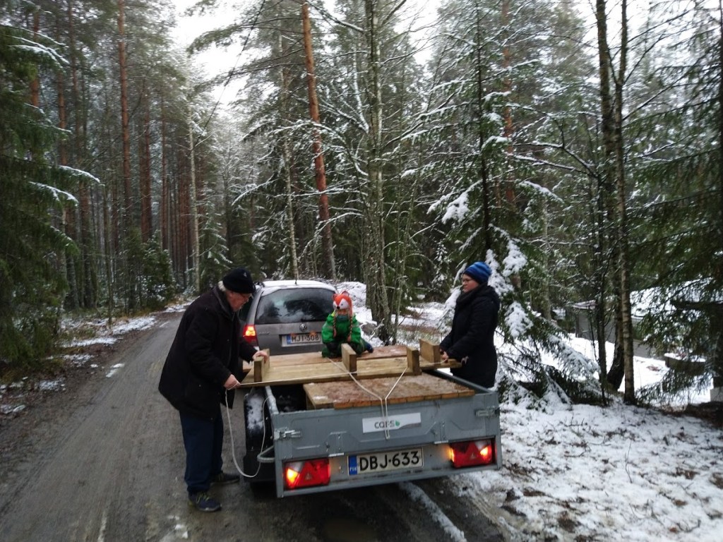 Mutta ensin pitää saada puurallit paikalleen, sillä lattia on muuten turhan matala. Kun Miika saapuu, hän vahvana miehenä saa nostaa ne sisälle. Kävimme samalla matkalla Hattulan Pyhän Ristin kirkolla viemässä kynttilät rakkaille.