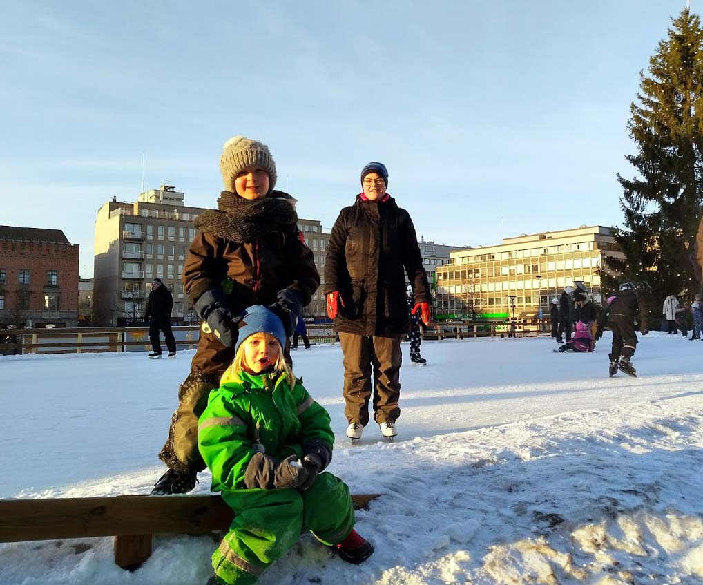 Eilen oli pitkästä aikaa kirkas pakkaspäivä. Anna ja pojat kävivät luistelemassa. Torin laidalla oleva luistinrata on ollut ahkerassa käytössä. Iltapäivällä punaposkiset pojat jäivät suosiolla katsomaan piirrettyjä elokuvia Jussi-papan kanssa.